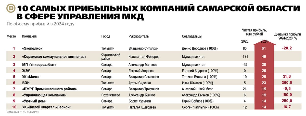 Строчкой ниже разместилась УК «Восточная». Она появилась в 2020 году. Первым собственником был Никита Калашников, в 2022 году его сменил Сергей Камалеев. В управлении у УК 22 дома. Выручка была на уровне 251 млн, прибыль — 11 млн рублей. Третья фирма — УК «ТЛТ» с 22-го места, созданная в 2019 году Натальей Очировой. В 2022-м хозяйкой стала Анна Суворова. В управлении у«ТЛТ» 22 дома. Выручка по итогам 2024 года — 230,5 млн рублей, прибыль — 1,6 млн.