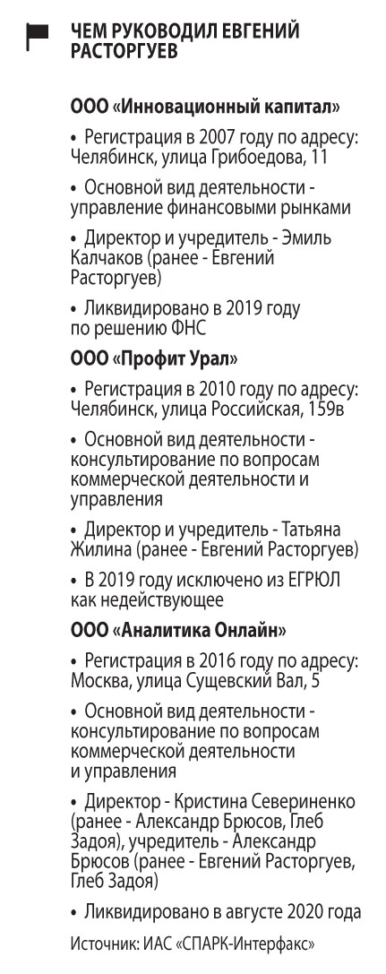 46-летний Евгений Расторгуев раньше жил в Челябинске, поэтому связанные с ним структуры прописаны именно там. Это фирма «Ин Кап», или «Инновационный капитал» со специализацией «Финансовые услуги», директором и учредителем которой после Расторгуева стал некий Эмиль Калчаков. Это юрлицо ликвидировано в 2019 году по решению ФНС. Кроме того, Расторгуеву принадлежала челябинская компания «Профит Урал», основанная в 2010 году. Когда у собственника начались проблемы с законом, компанию переписали на Татьяну Жилину, а в 2019 году исключили из ЕГРЮЛ как недействующую.