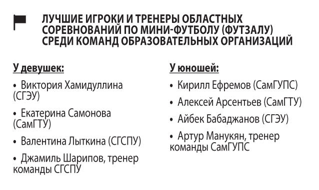 По итогам областного этапа по мини-футболу среди команд высших учебных заведений, который прошел в рамках всероссийского проекта «Мини-футбол — в вузы» в финал первенства вышли студентки СГСПУ и студенты СамГУПС. В решающей части соревнований им предстоит побороться за места на пьедестале с сильнейшими вузами страны.