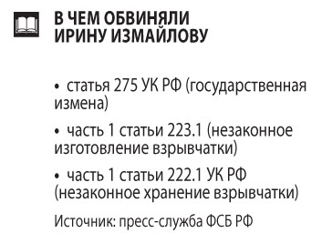 «Находясь на территории одного из государств Восточной Европы, она вступила в контакт с представителями Главного управления разведки Украины для выполнения их заданий в целях нанесения ущерба безопасности РФ. Измайлова И.О. осуществляла сбор и передачу информации в отношении объектов критически важной инфраструктуры, по заданию кураторов перевезла через Государственную границу РФ наушники со скрытыми печатными платами с радиоэлементами и компонентами, которые могли быть использованы для приведения в действие взрывного устройства. Кроме того, Измайлова И.О. изготовила инициирующее взрывчатое вещество с целью его использования для подготовки диверсий по заданию спецслужб Украины»