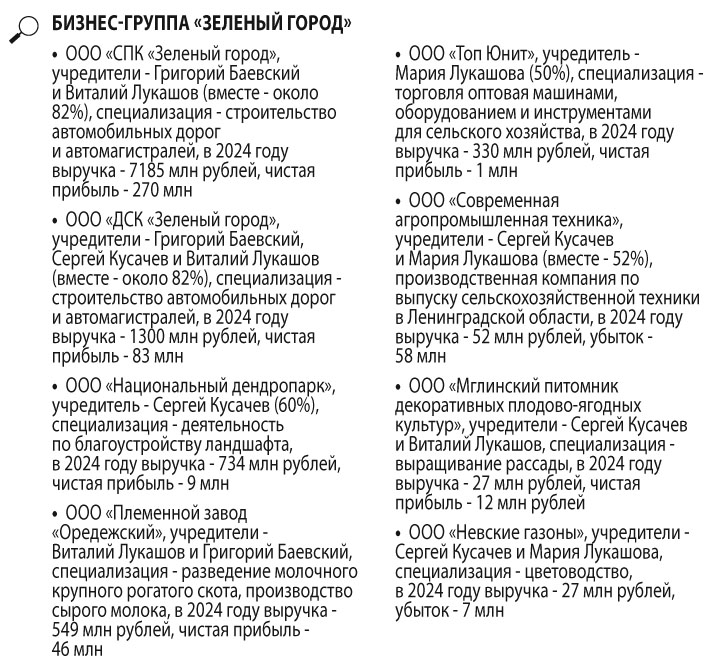 ООО «СПК «ЗГ» входит в состав питерской бизнес-группы, основными публичными собственниками которой являются Григорий Баевский, Сергей Кусачев и Виталий Лукашов (см. инфографику «Бизнес-группа «Зеленый город»). Самый известный из совладельцев — Баевский, в 2003-2009 годах возглавлявший ФГУП «Дирекция по инвестиционной деятельности», «дочку» Росимущества. Бизнес-группа делает ставку на госконтракты, ее основные партнеры — ФКУ УПРДОР «Прикамье» и ФКУ УПРДОР «Северо-Запад», территориальные подразделения Федерального дорожного агентства «Росавтодор».