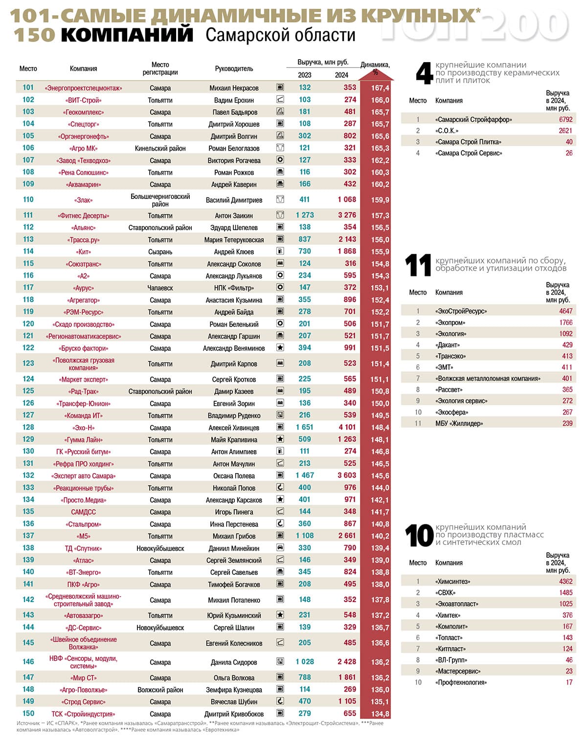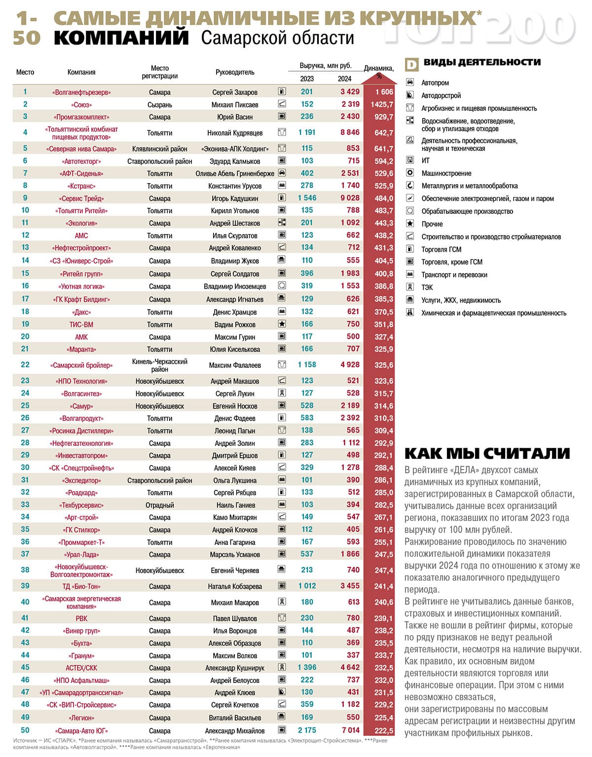 Вторую строчку в новом рейтинге «ДЕЛА» заняла компания «Союз», специализирующаяся на инфраструктурных проектах. Ее выручка выросла со 152 млн до 2,3 млрд рублей. Компания была зарегистрирована в Сызрани в 2008 году и многократно меняла собственников. С 2025-го капитал в равных долях делят Валерий Аверин и Михаил Пиксаев. Согласно сайту компании, в числе проектов, к которым она приложила руку, — Крымский мост и обход г. Тольятти. Однако миллиарды «Союзу» принесло не участие в стройках государственного масштаба, а два контракта со столичным ГБУ «Автомобильные дороги» на благоустройство территорий Южного административного округа Москвы.
