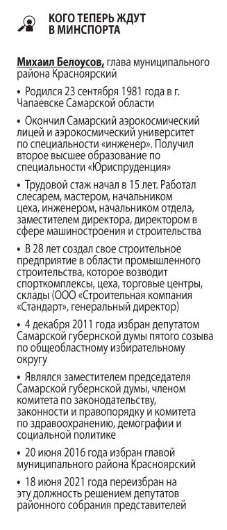 Михаил Белоусов в этом ряду стоит особняком, потому что до избрания главой Красноярского района 20 июня 2016 года не был связан с этой территорией. Он уроженец Чапаевска, окончивший Самарский аэрокосмический университет. Руководил строительной компанией «Стандарт», которая на тот момент была зарегистрирована в Самаре. Одновременно являлся депутатом губернской думы и вскоре пошел вверх и по партийной линии: сначала стал заместителем руководителя реготделения ЛДПР, а потом и первым лицом самарских либерал-демократов.