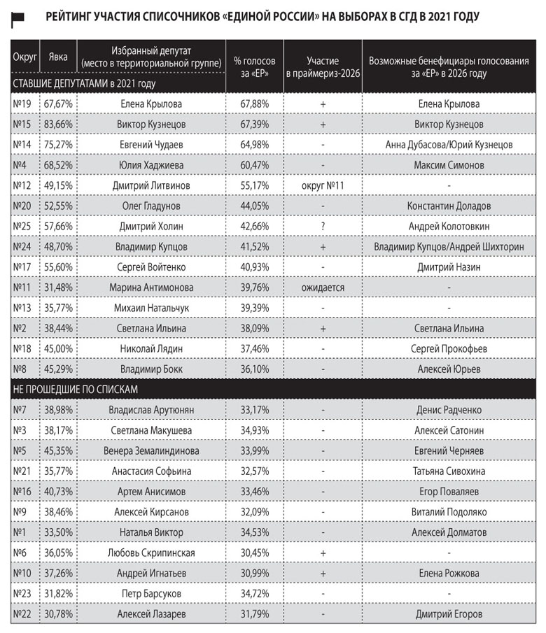 Два списочника — председатель думы Геннадий Котельников и волонтер Ирина Шматкова — не планируют, по версии ряда источников, в этом году выдвигаться на праймериз, хотя информация по спикеру периодически меняется на фоне неопределенности с фигурой его потенциального преемника. Не будут баллотироваться в этом году в новый созыв еще 7 единороссов.