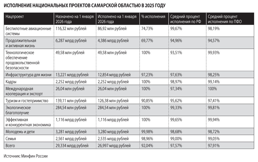Выкладки прокуратуры совпадают с данными мониторинга исполнения национальных проектов в 2025 году, которые на своем сайте приводит Минфин России. Согласно им, уровень освоения Самарской областью пяти нацпроектов оказался ниже среднего значения не только по РФ, но и по Приволжскому федеральному округу. Больше всего разница заметна на примере нацпроектов «Продолжительная и активная жизнь» и «Беспилотные авиационные системы». Первый исполнен на 69,77%, тогда как в среднем по России — на 94,96%, а по ПФО — на 94,57%. Средства второго удалось освоить на 74,73%, в то время как средний показатель в РФ — 99,67%, в ПФО — 98,19%. При сравнении регионов по исполнению нацпроектов в расчете на одного жителя губерния оказывается ниже среднего уровня и в целом по России, и в ПФО по многим нацпроектам.