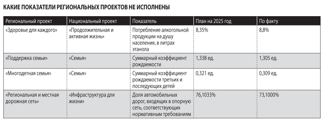 Всего в прошедшем году работа велась по 45 региональным проектам в рамках 12 новых нацпроектов, в том числе по двум — в рамках НП «Беспилотные авиационные системы». Прокурор в своем представлении констатировал, что региону не удалось достичь по ним необходимого кассового освоения бюджетных средств. В то время как совокупный объем финансирования мероприятий нацпроектов превысил 29,3 млрд рублей (из них 15,5 млрд — средства федерального бюджета), общая сумма исполнения по расходам по состоянию на 1 января 2026 года составила только 26,9 млрд, или 92,04%. В числе главных причин невыполнения плана прокуратура называет нарушение сроков ввода в эксплуатацию объектов капитального строительства, а также недостижение запланированных показателей и результатов.