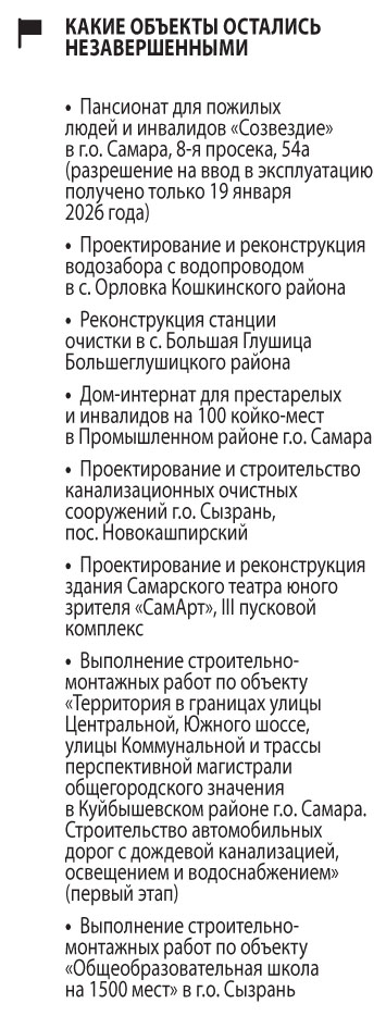 По данным Сергея Берижицкого, аналогичная ситуация прослеживается и на других объектах, строительство которых финансировалось из федерального бюджета. И, как и в случае с самарским домом-интернатом, по ним также приняты решения об исключении из мероприятий нацпроектов «ввиду просрочек исполнения обязательств по заключенным контрактам». В числе таких объектов — Самарский театр юного зрителя «СамАрт». Реконструкция третьей очереди объекта ведется с 2022 года, но с переменным успехом, и пока степень его готовности составляет всего около 40%. Работы на «СамАрте» пришлось приостановить в связи с необходимостью корректировки проектно-сметной документации.