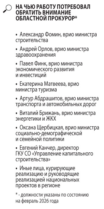 Вину за сложившуюся ситуацию областной прокурор возлагает на чиновников: «Нарушение сроков ввода объектов капитального строительства <…> свидетельствует о ненадлежащей организации работы со стороны министерств, являющихся ответственными исполнителями реализации национальных проектов в регионе (кураторами проектов)». «Более того, практикуя замену объектов капитального строительства с целью искусственного завершения мероприятий национальных проектов в регионе, без внимания областного правительства и ведомственных министерств остаются вопросы окончательного завершения работ и ввода таких объектов в эксплуатацию», — говорится в представлении.