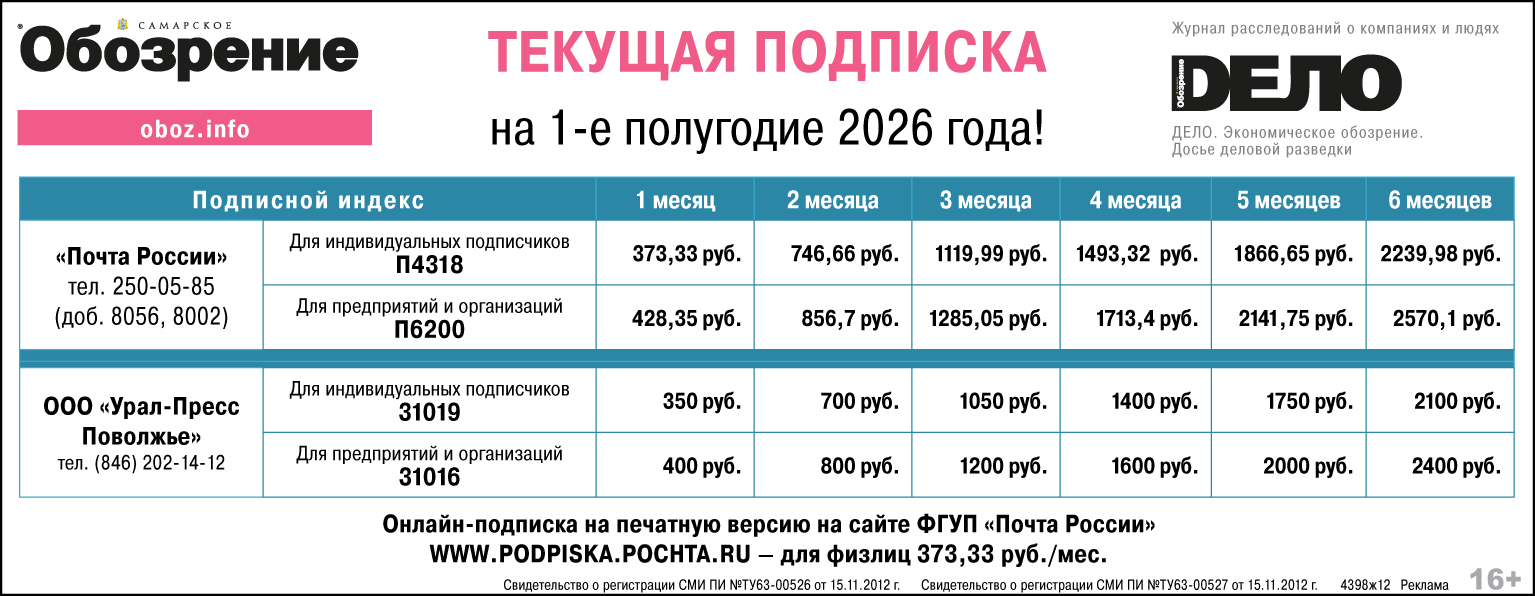 Читатели «Самарского обозрения» могут выбрать наиболее удобный вариант — как индивидуальную подписку в почтовый ящик, так и для юридических лиц, чтобы топ-менеджеры предприятий и руководители организаций каждый понедельник гарантированно получали свежий номер «Самарского обозрения» в свой офис.