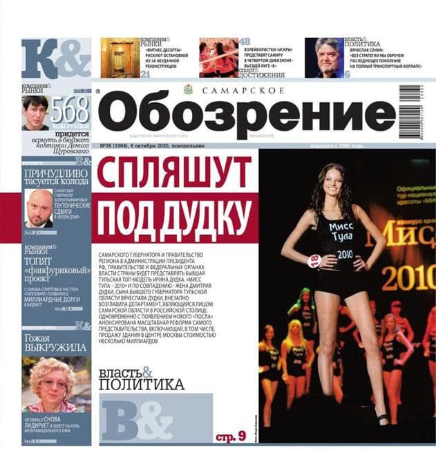 Самарского губернатора и правительство региона в Администрации Президента РФ, Правительстве и федеральных органах власти страны будет представлять бывшая тульская топ-модель Ирина Дудка. «Мисс Тула – 2010» и по совпадению — жена Дмитрия Дудки, сына бывшего губернатора Тульской области Вячеслава Дудки, внезапно возглавила департамент, являющийся лицом Самарской области в российской столице. Одновременно с появлением нового «посла» анонсирована масштабная реформа самого представительства, включающая, в том числе, продажу здания в центре Москвы стоимостью несколько миллиардов.