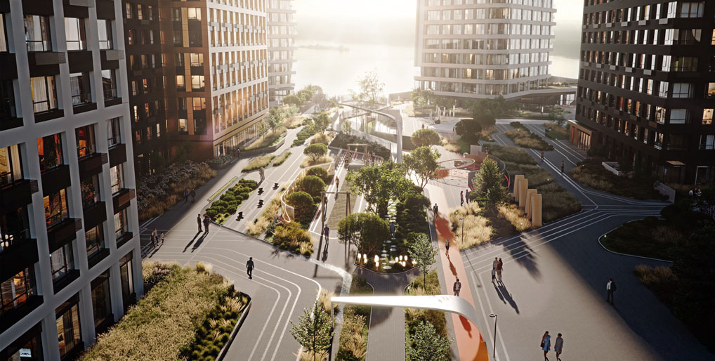 Именно существующий рельеф, зелень и близость воды формируют образ проекта. На этой основе создается концепция «парк-реки» площадью 1,6 гектара — с искусственным руслом, прогулочными маршрутами и многоуровневым озеленением. Новый зеленый каркас не просто компенсирует плотность застройки, а задает среде характер, связывает архитектуру с местом и возвращает территории природную идентичность, утраченную в период ее промышленного освоения. Такой подход работает сразу в нескольких направлениях: сохраняет визуальную и экологическую преемственность участка, формирует комфортный микроклимат, создает человечную, проницаемую среду. Ландшафтные решения в «Грин Ривер» — это не декоративное приложение к жилому комплексу, а полноценная часть его сущности.
