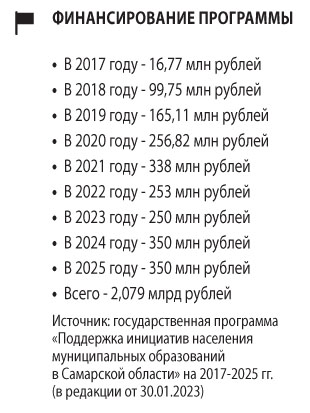 Государственная программа «Поддержка инициатив населения муниципальных образований в Самарской области» принята в 2017 году со сроком действия до 2025 года. Власти тогда констатировали определенные сложности с благоустройством и развитием муниципальных территорий. Эти сферы российским законодательством отнесены к вопросам местного значения, решать которые население и органы МСУ должны самостоятельно. Но людей обычно сдерживает недостаток опыта, а местные власти — скромность муниципальных бюджетов.
