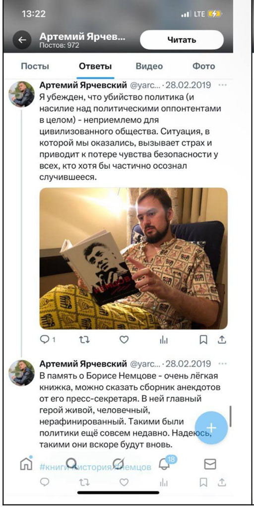 С Артемием Ярчевским я не знаком ни лично, ни заочно. Не читал его [соцсети], поэтому что-либо сказать о нем мне сложно. Но, как говорил Черчилль, «глуп тот человек, который никогда не меняет своего мнения». Мне кажется, было бы правильно, если есть такие публикации, о которых вы говорите, подчистить их, прокомментировать, изменить и т.д. Ни Немцова, ни Навального* (включен в реестр террористов и экстремистов. — Прим. ред.) давно нет в живых. И мне, как гражданину России, не хотелось бы, чтобы в структурах власти были последователи перечисленных выше фамилий.