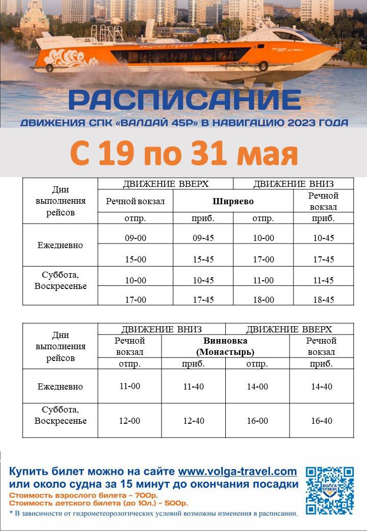 В рабочие дни из Самары суда выходят на маршрут в 9:00 и 15:00. По выходным – еще и в 10:00 и 17:00. Возвращаются обратно в 10:00 и 17:00 ежедневно и в 11:00 и 18:00 дополнительно по выходным.