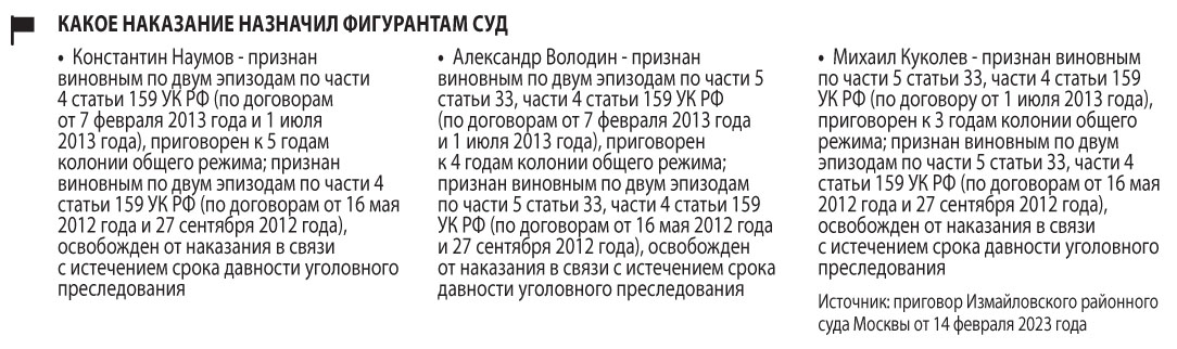 Уголовное дело «космических мошенников» рассматривал Измайловский суд Москвы. Процесс стартовал весной 2022 года. Фигуранты вину не признали, хотя ранее на следствии говорили, что все вмененные им договоры были фиктивными (Наумов позже объяснял это тем, что на них оказывалось давление). Впрочем, суд взял за основу версию обвинения и в феврале 2023 года приговорил всех троих фигурантов к реальным срокам лишения свободы по эпизодам, датированным 2013 годом. От наказания по эпизодам 2012 года их освободили в связи с истечением сроков давности. А вот гражданский иск самарского прокурора по надзору за исполнением законов на особо режимных объектах о взыскании с подсудимых суммы причиненного ущерба был оставлен судом без рассмотрения.