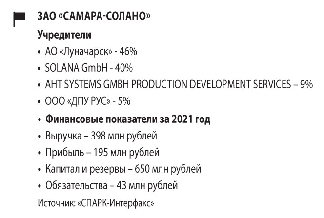 Этот расклад сил среди акционеров «Самара-Соланы» сохранился и по сей день. По данным системы «СПАРК-Интерфакс», 46% компании принадлежит «Луначарску», 40% — SOLANA GmbH. АHT GROUP GmbH владеет 9% самарской компании напрямую, а 6% через ООО «ДПУ Рус», директором которого выступает все та же Людмила Орлова. В прошлом году «Самара-Солана» продемонстрировала рекордные для нее показатели. Выручка компании вплотную приблизилась к отметке в 400 млн рублей, прибыль составила около 195 млн рублей.