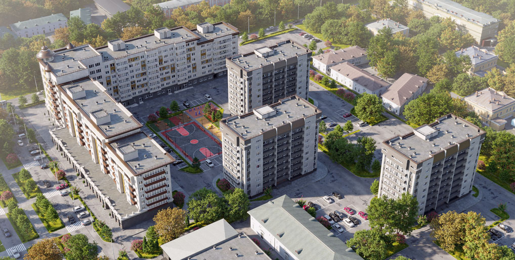 На территории жилого комплекса «Евпатория парк» предусмотрены закрытый от машин двор с игровыми и спортивными площадками и магазины на первых этажах.