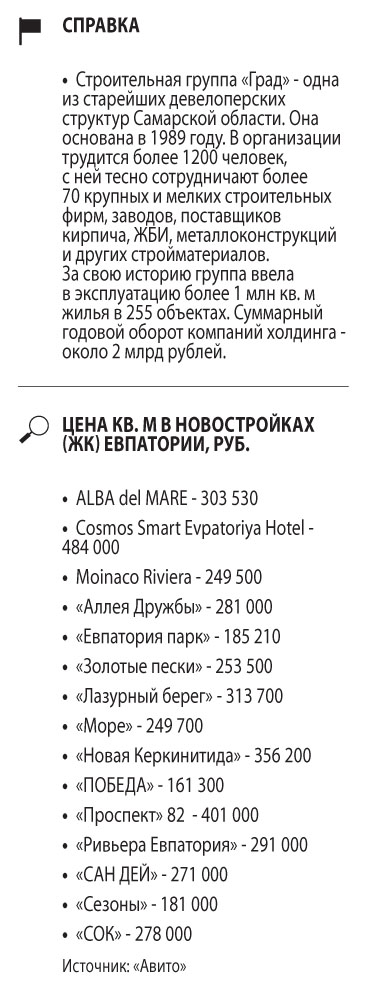 Объединение строительных компаний «Град» — один из крупнейших застройщиков Самарской области — форсирует реализацию своего пилотного проекта возведения жилого комплекса «Евпатория парк» в Крыму.