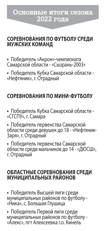 Вдвое повысился интерес к Кубку области. В прошлом году за трофей боролись пять команд муниципальных образований региона, в 2022-м — 12, и обладателем Кубка Самарской области стал отрадненский «Нефтяник». «Как организаторам этих соревнований нам было приятно видеть большое количество болельщиков на стадионе в Отрадном. Очень много детей, молодежи пришли поддержать родную команду. Это говорит о том, что футбол в городе живет и развивается», — подчеркнул Максим Симонов.