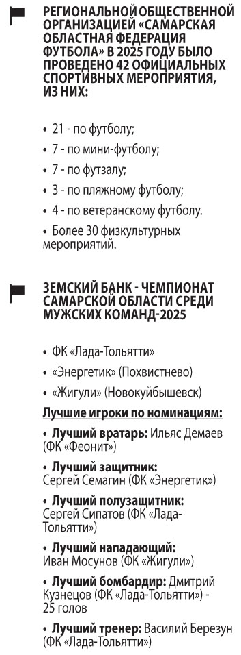 Ближе всех к тольяттинцам подобрался похвистневский «Энергетик»: в его активе 46 очков, и в результате он опередил завоевавшие бронзу «Жигули». Как отметили наставники призеров чемпионата области-2025, трансферная кампания «Лады» ослабила их команды, но в целом они довольны своими результатами. «В общем, в этом сезоне получилось практически все, кроме чемпионства, за которое мы будем бороться в следующем году. Сезон прошел на отличном уровне как в команде, так и в организации чемпионата. Плохо, что после первого круга пять основных игроков ушли играть за «Ладу-Тольятти» — им предложили более выгодные условия. Но мы не расстроились и в свою очередь заявили молодых игроков, которые нам помогли стать вице-чемпионами. Я думаю, что наше второе место — престижное, так как «Лада» своей достойной трансферной кампанией ослабила многие команды нашего чемпионата», — отметил руководитель команды «Энергетик» Сергей Коротков. «Третье место закономерно. Не хватило глубины состава и эмоций в концовке. В зимнем чемпионате отдыхаем — нужно перезагрузиться», — добавил представитель «Жигулей» Егор Едуков.