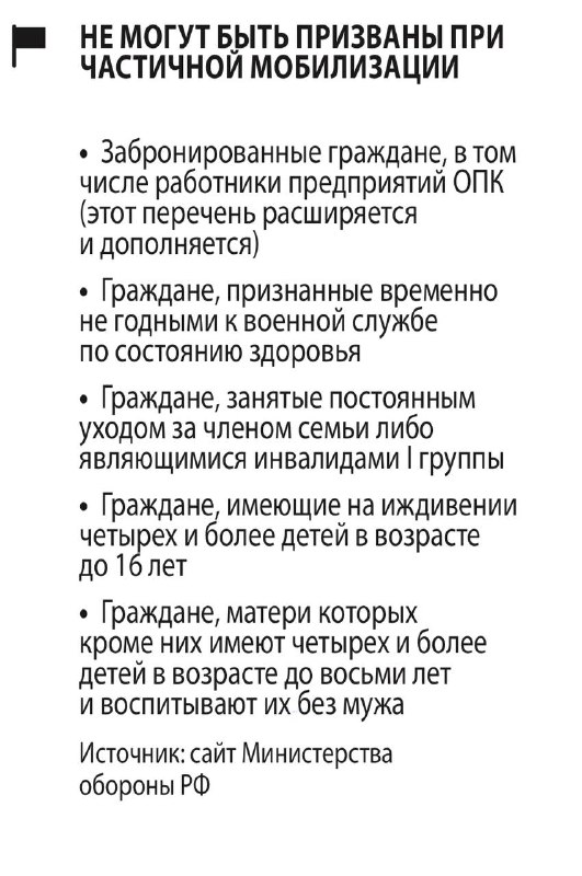 Некоторые политики уже начали выражать беспокойство относительно того, что мобилизованы могут быть те, кто сейчас нужнее внутри страны. Например, лидер коммунистов Геннадий Зюганов на заседании Государственной думы напомнил, что во время Великой Отечественной войны «бронь» была у трактористов. «И нам надо мобилизацию проводить с пониманием того, что она не должна приводить к мощным ударам по экономике, — говорит депутат Госдумы Михаил Матвеев. — Ко мне, например, есть обращения сотрудников РКС и ряда других структур, связанных с обеспечением коммунальными услугами, которые ставят вопросы, кто при мобилизации будет устранять коммунальные аварии или обеспечивать отопительный сезон и работу ЖКХ. А по информации, которая есть сейчас, для вручения повесток активно используется ресурс кадровиков бюджетных организаций и госкорпораций — когда призыв идет по месту работы, а не по месту жительства». В пятницу Минобороны разъяснило, кого считает важным оставить на местах — с целью «обеспечения работы отдельных высокотехнологических отраслей, а также финансовой системы» страны. Так, не будут привлекать на военную службу в рамках частичной мобилизации граждан с профильным высшим образованием, работающих в области информационных технологий и обеспечения функционирования информационной инфраструктуры, у российских операторов связи и т.п. А также — в организациях, обеспечивающих стабильность национальной платежной системы и инфраструктуры финансового рынка. Основанием для освобождения таких граждан от призыва будут считаться списки граждан, представляемые руководителями их организаций в Генштаб.