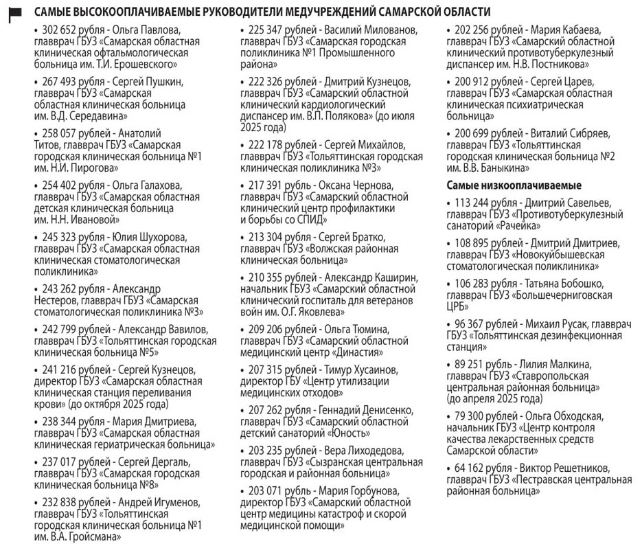 Хорошо оплачивается труд топ-менеджеров и в других учреждениях, подведомственных министерству здравоохранения Самарской области. Директор областного центра медицины катастроф и скорой медпомощи Мария Горбунова ежемесячно зарабатывала в 2025 году по 203 071 рублю, а новый главврач детского санатория «Юность» Геннадий Денисенко — по 207 262 рубля. Директор ГБУ «Центр утилизации медицинских отходов» Тимур Хусаинов может похвастаться заработком в 207 315 рублей. Когда г-н Хусаинов возглавлял одноименное унитарное госпредприятие, подведомственное министерству имущественных отношений, он таких доходов не знал.