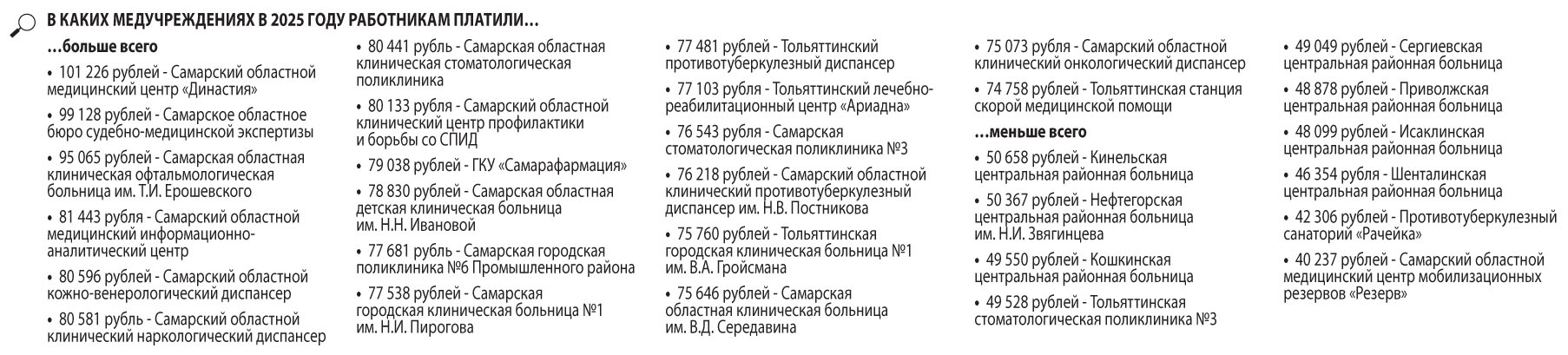 Еще один тренд — в регионе существенно сократилось число медучреждений, в которых врачи и медсестры получают в среднем меньше 50 тысяч рублей. Самая же высокая средняя зарплата медработников в Самарской области — в медицинском центре «Династия», чьи сотрудники ежемесячно зарабатывали в 2025 году по 101 226 рублей. За год зарплата в медцентре выросла на 26,5% и впервые в регионе превысила планку в 100 тысяч. На втором месте по уровню средней зарплаты работников — областное бюро судебно-медицинской экспертизы, лидер последних двух лет. Если в 2024 году сотрудники этого учреждения получали в среднем по 91 123 рубля, то в 2025-м — уже по 99 128 рублей. А среди лечебных учреждений, как отмечено выше, самая высокая зарплата — в областной офтальмологической больнице имени Ерошевского. Более 80 тысяч в месяц медперсоналу платили кожно-венерологический и наркологический диспансеры, областная стоматологическая поликлиника, СПИД-центр, а также Самарский областной медицинский информационно-аналитический центр (МИАЦ), отвечающий за информатизацию отрасли здравоохранения. Выросли зарплаты и в областной больнице имени Середавина. Весь прошлый год ее врачам платили ежемесячно по 75 646 рублей, тогда как в 2024-м — по 69 326 рублей.