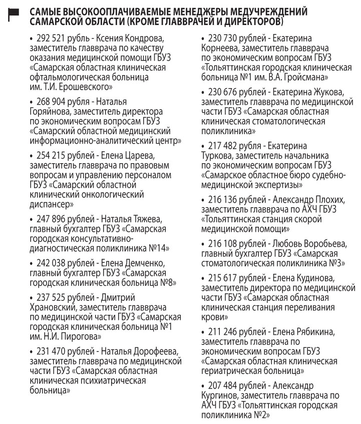 Очередная публикация средних зарплат медиков выявила ряд новых тенденций. Во-первых, в Самарской области почти не осталось главврачей, получающих за свою работу меньше 100 тысяч рублей в месяц, а оклады под 200 тысяч и выше стали уже привычным явлением. Свой ежегодный топ самых высокооплачиваемых руководителей медучреждений области «СО» составило исключительно из тех главврачей, чей средний заработок перевалил за 200 тысяч. Причем рейтинг даже пришлось расширить до 25 участников, чтобы вместить как можно больше самых «доходных» топ-менеджеров от государственной медицины.