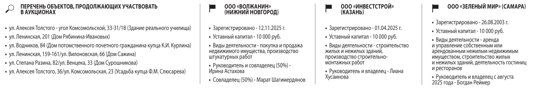 Компания из Казани ООО «Инвестстрой» победила в аукционе на право реставрации объекта в статусе ЦГФО «Полукаменный дом и каменный флигель на усадьбе коллежского асессора П. Понафидина» на ул. Фрунзе, 123-125. За здание площадью 117,7 кв. м и земельный участок в 103 кв. м казанцы заплатят 2,68 млн рублей. По оценке специалистов, ремонт и реконструкция дома обойдутся примерно в 25 млн рублей. Владельцем «Инвестстроя», по данным «СПАРК-Интерфакса», является Лиана Хусаинова, она же в июне прошлого года стала соучредителем самарского ООО «Сервисная компания «Городок» вместе с Илсей Шамсутдиновой (75% доли). Основная деятельность «Городка» — управление недвижимым имуществом за вознаграждение или на договорной основе. Кроме того, Лиана Хусаинова является владельцем ООО «Вонтрезалт», зарегистрированного в городе Арске Республики Татарстан. Деятельность компании — управление финансово-промышленными группами.