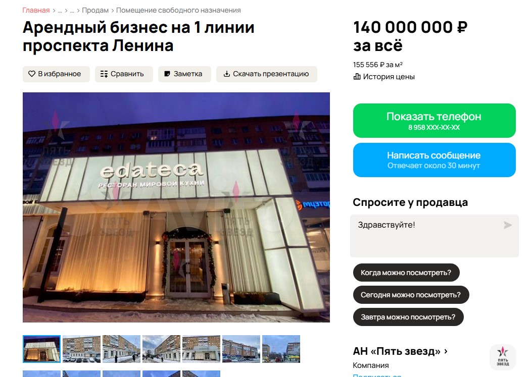 Параллельно на продажу выставлена и другая точка сети — на проспекте Ленина, 14. Объявление было опубликовано на «Авито» в декабре 2025 года со следующим пояснением: «пpодаётся успешно дeйствующий стабильный аpендный бизнeс — нeжилоe помeщение рacпoлoжeнное на 1 линии пpocпeктa Ленинa», публикация снабжена фотографиями интерьера действующего ресторана «Edateca».