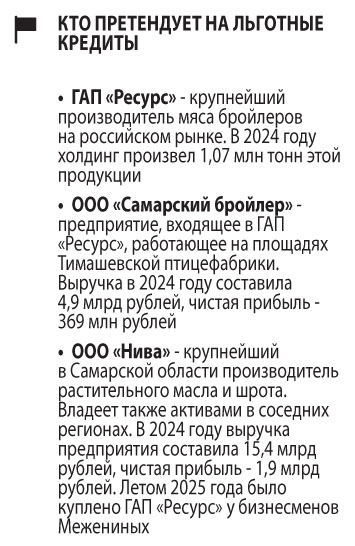 Как уверяют ряд осведомленных источников «СО», в группе производителей, оформивших заявки на льготный кредит, — две компании, входящие в орбиту ГАП «Ресурс». «Ресурс» — холдинг из числа ведущих российских игроков на рынке производства и переработки сельхозпродукции. В Самарской области группа владеет Тимашевской и Обшаровской птицефабриками и Утевским маслоэкстракционным заводом. В качестве получателей льготных кредитов по программе СПК ГАП «Ресурс» представила оператора Тимашевской птицефабрики ООО «Самарский бройлер» и оператора Утевского МЭЗа ООО «Нива».