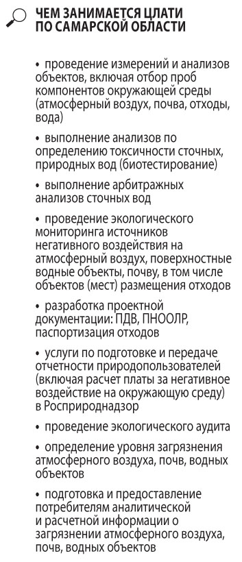 ФГБУ «Центр лабораторного анализа и технических измерений по ПФО» (ЦЛАТИ) находится в ведении Росприроднадзора и обеспечивает аналитические работы, связанные с контрольно-надзорной деятельностью природоохранной службы. Среди основных задач учреждения — выявление превышений установленных нормативов допустимого воздействия на экологию, установление влияния сбрасываемых сточных вод на водный объект, расчет размера вреда, причиненного объектам окружающей среды. ЦЛАТИ по ПФО имеет разветвленную структуру: помимо головного офиса, базирующегося в Нижнем Новгороде, в его состав входят 12 филиалов в каждом регионе округа. «Каждый филиал — это комплекс, включающий в себя современные лаборатории. Все лаборатории оснащены современными приборами и оборудованием, как стационарным, так и мобильным, что позволяет проводить уникальные исследования в самых сложных условиях», — говорится на официальном сайте центра.