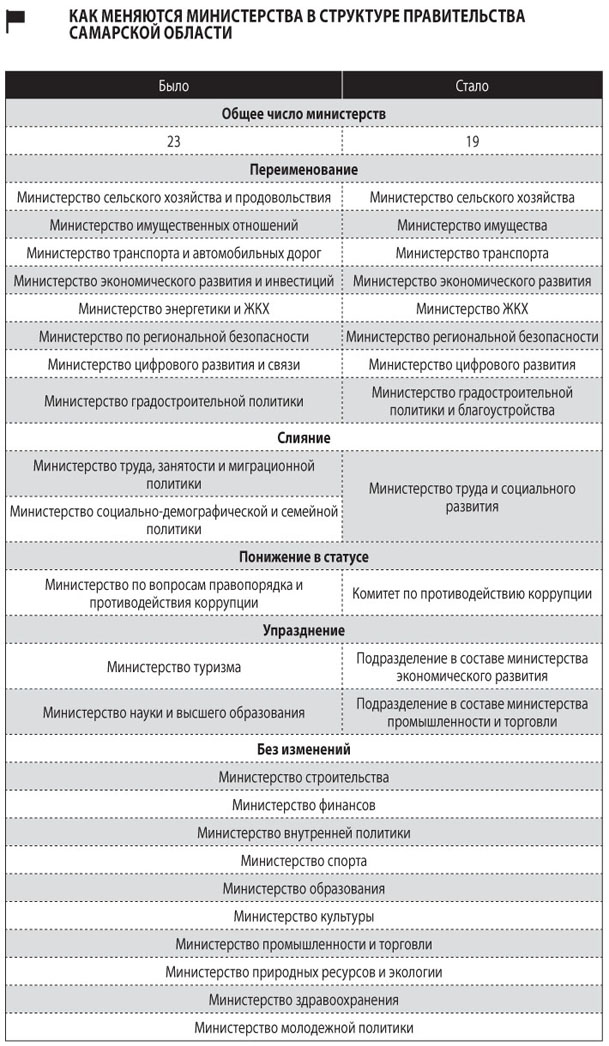 В то же время, как и анонсировал губернатор, два самостоятельных ведомства — минтруд и минсоцдемографии — объединяются в одно, которое будет называться министерством труда и социального развития. В этом плане самарский «Белый дом» снова приближается к федеральному уровню. Кроме того, в новой структуре остается только одно «силовое» министерство — региональной безопасности, тогда как другое министерство — по вопросам правопорядка и противодействия коррупции — понижается в статусе до комитета. Всего же по сравнению с пока еще действующей структурой областного правительства число министерств уменьшается с 23 до 19.