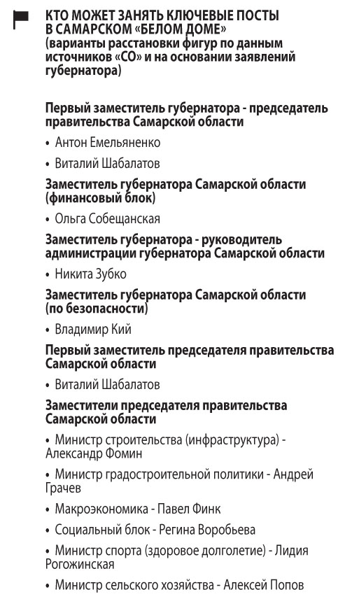 Собеседники «СО» ожидают, что основные интриги связаны с позицией первого заместителя губернатора — председателя правительства Самарской области. По данным источников, близких к центру принятия решений, сейчас перебирается несколько возможных кандидатур. Среди них — нынешний врио вице-губернатора Антон Емельяненко и зампред правительства Виталий Шабалатов.