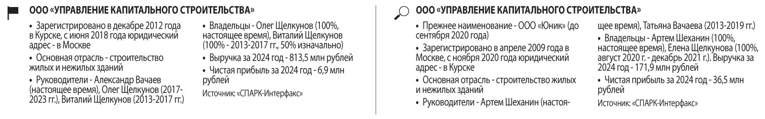 В настоящий момент представлявшая на встрече в самарском минграде «московского инвестора» Татьяна Губанова, по данным «СПАРК-Интерфакса», не входит ни в состав учредителей, ни в число руководителей фирм. Но при изучении истории этих юридических лиц следы совместного ведения бизнеса в обоих УКСах все-таки просматриваются. В составе учредителей курского УКС за 16 лет его существования успело побывать 7 человек. Сейчас его единоличным владельцем (и по совместительству — генеральным директором) является Артем Шеханин, который получил контроль над фирмой в декабре 2021 года. До него, с августа 2020 года, это УКС принадлежало некой Елене Щелкуновой. В то время как московское УКС с 2013 года находилось в собственности Виталия Щелкунова, а в марте 2017-го перешло к Олегу Щелкунову. При этом в период, когда обе фирмы находились в собственности Щелкуновых, они некоторое время также были официально зарегистрированы в одном городе, Москве. Еще одной примечательной деталью является то, что с 2013 по 2019 год курское УКС возглавляла Татьяна Вачаева. Должность генерального директора в московском же с августа 2024-го занимает Александр Вачаев.