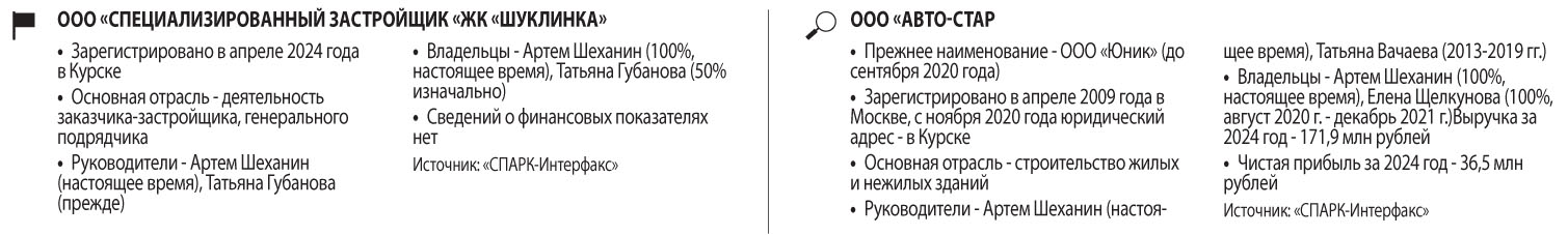 При этом владельцы обеих фирм в прошлом вели совместный бизнес и с Татьяной Губановой. Вместе с Артемом Шеханиным она в 2024 году основала в Курске ООО «СЗ «ЖК «Шуклинка», которым также и руководила. Пока в октябре 2025 года не передала долю вместе с креслом директора партнеру. А Виталий Щелкунов в конце лета 2013 года сменил Губанову в ныне ликвидированном севастопольском ООО «Авто-Стар», став единоличным владельцем и руководителем данной компании. «Авто-Стар» признали банкротом в октябре 2021 года, ликвидация фирмы официально завершилась в декабре 2025-го.
