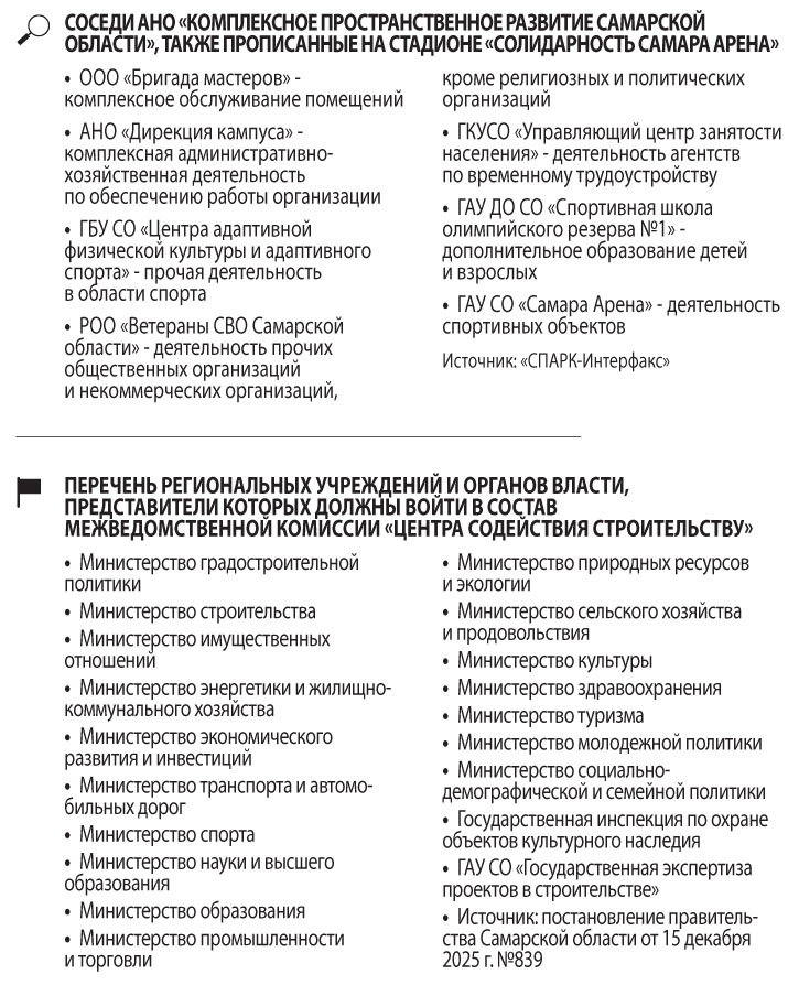 Возможно, ответ на него стоит искать в истоках появления самой организации. Как указано на его сайте, ИРТИС учрежден при министерстве градостроительной политики на базе АНО «Комплексное пространственное развитие Самарской области». Само по себе «Комплексное пространственное развитие» — структура уже не новая. Она учреждена еще в 2022 году на базе регионального минстроя. Постановление об этом подписано бывшим первым вице-губернатором и председателем правительства области Виктором Кудряшовым 6 апреля того года. Создавали его для эффективной реализации основных направлений стратегического развития в сфере градостроительства, в том числе — развития Самарско-Тольяттинской агломерации и реализации проектов комплексного развития территорий. По информации из системы «СПАРК-Интерфакс», официально свою деятельность КПР начало 25 июля 2022 года. Его директором был назначен некто Алексей Абрамов. Сведений о его деятельности в других организациях, не считая присутствия в составе учредителей ПК «Гаражно-строительный кооператив №606», в системе нет. А прописано КПР на стадионе «Солидарность Самара Арена» — ул. Демократическая, соор. 57. По соседству с ним зарегистрировано еще несколько подведомственных региональному правительству учреждений (см. «Соседи АНО «Комплексное пространственное развитие»).