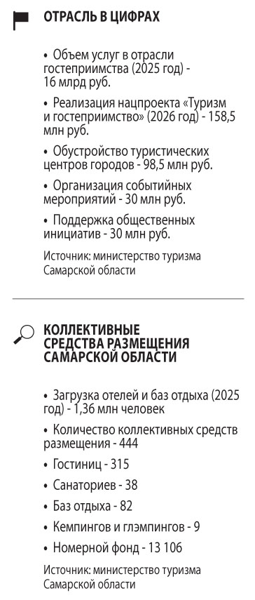 Основными точками притяжения туристов в регионе являются Самара, в которой расположено большое количество учреждений культуры, музеев, объектов культурного наследия, Сызрань, где сохранились старинный кремль и расположенная на его территории церковь Рождества Христова, а также Тольятти с АвтоВАЗом, техническим музеем и архитектурой советского постмодернизма. Областная столица по праву считается родиной стиля «русский провинциальный модерн» и музеем под открытым небом. Всего же на территории региона расположены более тысячи объектов культурного наследия. В 2025 году в рамках национального проекта «Туризм и гостеприимство» на территории Сызрани и Самары был реализован второй этап обустройства туристических пространств. В границах туристического кода в Сызрани дополнительно размещены малые архитектурные формы, в Самаре установлены санитарные и ярмарочные павильоны. В Сызрани вторую жизнь обрели три набережные: Кремлевская, Монастырская и Крымзенская. Благоустроен центральный пляж «Мельница». Благодаря проекту «Туристский код центра города» создано привлекательное туристическое пространство, оформленное в едином стиле, создан пешеходный туристический маршрут от улицы Московской («Входные ворота») до Кремлевской набережной, наполненный объектами для отдыха и досуга. Маршрут проходит через скверы и парки, что дает посетителям возможность одновременно познакомиться с исторической, традиционной и современной сторонами города. В 2026 году работа с муниципалитетами продолжится. По итогам отбора министерства межбюджетные трансферты будут предоставлены Самаре и Тольятти на обустройство их туристических пространств, которые пользуются популярностью не только у туристов, но и у местных жителей. В Самаре на речном вокзале установят дополнительные ярмарочные павильоны, а в Тольятти — памятник первому директору АвтоВАЗа Виктору Полякову, малые архитектурные формы и санитарные модули, в том числе для маломобильных граждан. В Автограде реализуется и крупный инвестиционный проект — строительство акватермального комплекса «Атолл». «ООО «Атолл» получило льготный кредит по программе предоставления субсидий из федерального бюджета и в 2023 году заключило инвестиционный меморандум с правительством Самарской области и администрацией городского округа Тольятти. Акватермальный комплекс «Атолл» входит в перечень стратегических инвестиционных проектов региона. В 2026 году было подписано соглашение между областным правительством и муниципалитетом об осуществлении деятельности на территории опережающего развития «Тольятти», — рассказывает заместитель директора по развитию и маркетингу акватермального комплекса «Атолл» Алла Валиуллова. Государственные гранты позволили нарастить объемы предоставляемых услуг и экопарку семейного отдыха «Маламут Ленд». «Грантовая поддержка со стороны министерства туризма Самарской области помогла предоставить возможность проживания гостям на территории экопарка, а собственные инвестиции в инфраструктуру способствуют ее модернизации. Сейчас гостям доступны два больших просторных дома с видом на Жигулевские горы и 10 круглогодичных сафари-тентов, сочетающих тему Грушинского фестиваля и комфорт номеров высокого уровня», — сообщила «СО» генеральный директор ООО «Маламут Ле