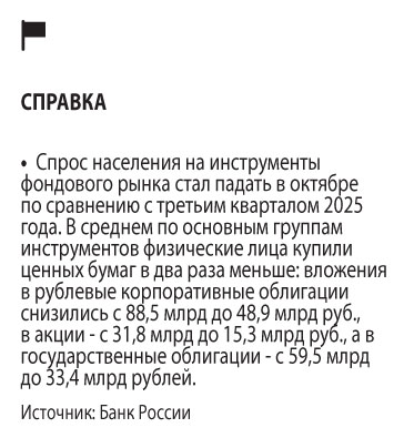 Помимо прочего, в октябре практически в три раза снизились объемы покупки акций частными инвесторами. «Основной спрос на рынке акций продолжают предъявлять физические лица, снизившие нетто-покупки с 43,1 млрд руб. в сентябре до 13,3 млрд руб. в октябре», — сообщается в обзоре Банка России.
