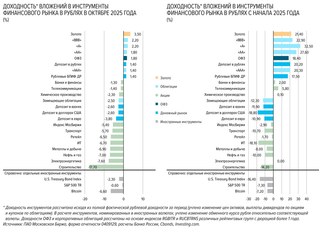 «Рублевые облигации и инструменты денежного рынка (рублевые депозиты, БПИФ денежного рынка) в октябре показали положительную полную доходность. При этом на фоне сохраняющейся геополитической напряженности наибольшая доходность, как и месяцем ранее, была у золота (+3,5%). Инструменты рынка акций, напротив, продемонстрировали отрицательную полную доходность за месяц (от -1,3 до -17,7%). Также отрицательная доходность среди российских финансовых инструментов наблюдалась у валютных депозитов», — отмечается в подготовленном Банком России обзоре рисков финансовых рынков по итогам октября. Интересно, что при этом спрос на валютные депозиты в прошлом месяце вырос: вложения составили 234 млрд в рублевом эквиваленте. Но рублевые депозиты все же остались значительно популярнее — в них, по предварительной оценке, за октябрь поступило 722 млрд рублей.