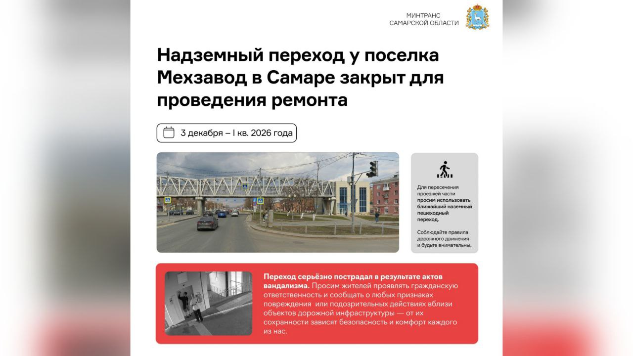 В марте жители Самары пожаловались губернатору Вячеславу Федорищеву на состояние пешеходного моста, в котором на тот момент уже не работали лифты, пожарная система и камеры видеонаблюдения. Из-за вандалов полностью повреждены линии электроснабжения и связи, обеспечивающие работу лифтов для маломобильных граждан, систем вентиляции и пожаротушения, сообщает министерство. Множественные повреждения нанесены конструктивным элементам, остеклению, внутренней отделке и освещению.