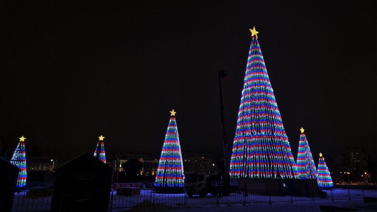 На площади Куйбышева создают новогоднюю сказку. Уже сейчас в центре композиции сияет огнями главная ель, которую окружает шесть красавиц ярких «сестер» меньшего размера. Украшение зеленого ансамбля продолжается и днем, и ночью, но праздничная иллюминация на всех семи новогодних деревьях уже радует глаз.