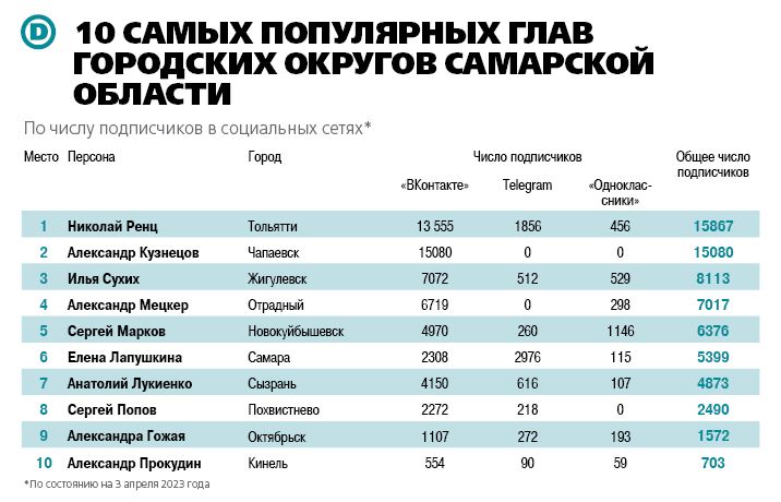 В целом в числе 30 самых популярных самарских политиков в соцсетях 19 — депутаты различных уровней и только 11 глав городов и районов региона. При этом в первую десятку помимо Николая Ренца вошли глава Чапаевска Александр Кузнецов (сын упомянутого выше Виктора Кузнецова), глава Сергиевского района Анатолий Екамасов и глава Жигулевска Илья Сухих.