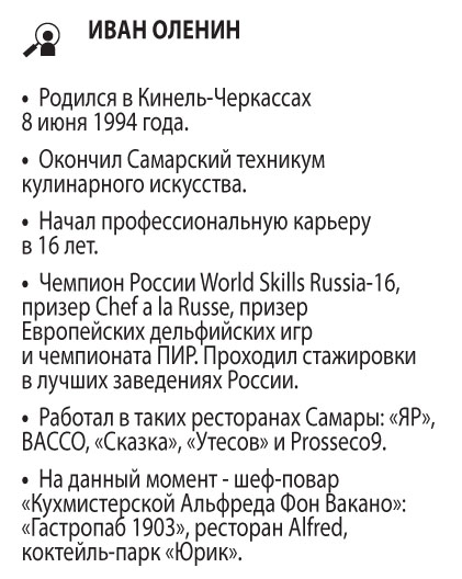— Мне 28 лет, и я работал только поваром, соответственно, карьеру строю именно на этом поприще, сейчас у меня общий стаж работы 12 лет. Одно время уходил преподавать в Самарский государственный колледж сервисных технологий и дизайна, но хватило меня примерно на год. Хотел давать молодым студентам знания и развивать профессию. Почему так мало был преподавателем? Все, казалось бы, здорово и классно: выходные, нормированный рабочий день, утвержденные программы обучения. Но нет адреналина и азарта. Когда ты работаешь на кухне — фактически ты живешь здесь. Как сказал повар из моей команды: «Шеф, я вас вижу чаще, чем маму».