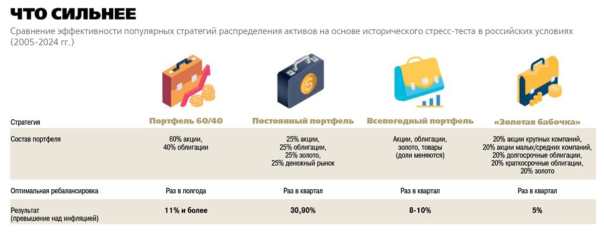 Пассивные стратегии, известные как Buy & Hold («купи и держи»), предполагают, что инвестор формирует портфель один раз и сохраняет его долгие годы, минимизируя комиссионные издержки. Стратегии требуют заранее заданных пропорций, например 60% акций и 40% облигаций. Календарные стратегии проводят ребалансировку к первоначальному соотношению по выбранному графику: раз в год, квартал или месяц. Тактические стратегии допускают временные отклонения от базовых пропорций ради использования конкретных рыночных возможностей. Лаборатория исследований рынка инвестиций (ЛИРИ) «Альфа-Капитал» провела стресс-тест, чтобы оценить, как эти популярные стратегии работают в российских условиях.