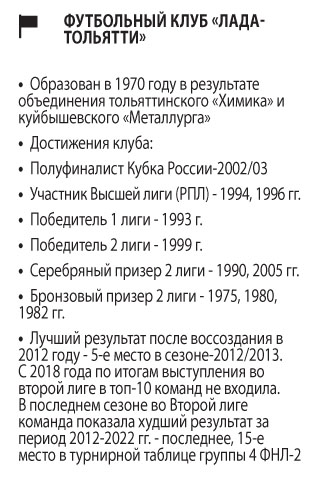 А на протяжении последних семи лет «Лада» по итогам выступления во Второй лиге не входила в топ-10 команд-участниц. В прошлом году футбольный клуб «Лада-Тольятти» прошел лицензирование, однако в итоге Самарская область так и не была представлена в первенстве Футбольной национальной лиги-2. За три недели до старта сезона — в июле — руководство клуба сообщило о решении приостановить профессиональную деятельность ФК «Лада-Тольятти» на сезон-2022/23. Основная причина такого шага — неподтвержденное финансирование от минспорта Самарской области, не выделившего субсидию в размере 10 млн рублей.