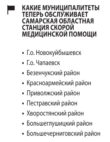 Далее изменения последовали и для расположенной в Новокуйбышевске Самарской областной станции скорой медицинской помощи. Из городской станции, обслуживавшей в основном город Новокуйбышевск и прилегающие территории, она выросла до областной, которой передали подстанции больниц еще нескольких муниципалитетов. В итоге в зоне обслуживания областной станции СМП оказались одновременно семь территорий, включая Новокуйбышевск, Чапаевск, Безенчукский и Красноармейский районы. В этом году в зону ее обслуживания включили еще несколько муниципалитетов — Приволжский, Хворостянский, Пестравский, Большеглушицкий и Большечерниговский районы.