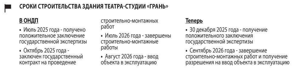 В мае 2025-го губернатор Вячеслав Федорищев утвердил основные направления деятельности правительства (ОНДП) по реализации программы социально-экономического развития Самарской области на период до 2029 года и этим документом сильно сдвинул «вправо» сроки завершения работ на ключевых культурных стройках региона, включая театр-студию «Грань». Согласно заявленному в ОНДП графику, в июле 2025-го должно было быть получено положительное заключение госэкспертизы на перепроектированную проектно-сметную документацию, а уже в октябре — заключен очередной госконтракт на завершение строительно-монтажных работ. Если бы эти сроки были выдержаны, то, судя по обозначенным в ОНДП планам, строительство «Грани» завершилось бы в июле 2026 года, а в августе объект ввели бы в эксплуатацию и театр открылся бы для публики.
