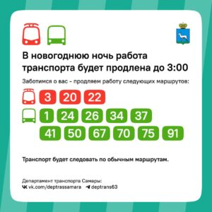 В новогоднюю ночь самарский общественный транспорт будет работать дольше обычного. Для удобства горожан и гостей, которые планируют отмечать праздник в центре, с 31 декабря на 1 января продлят движение трёх трамвайных и одиннадцати автобусных маршрутов.