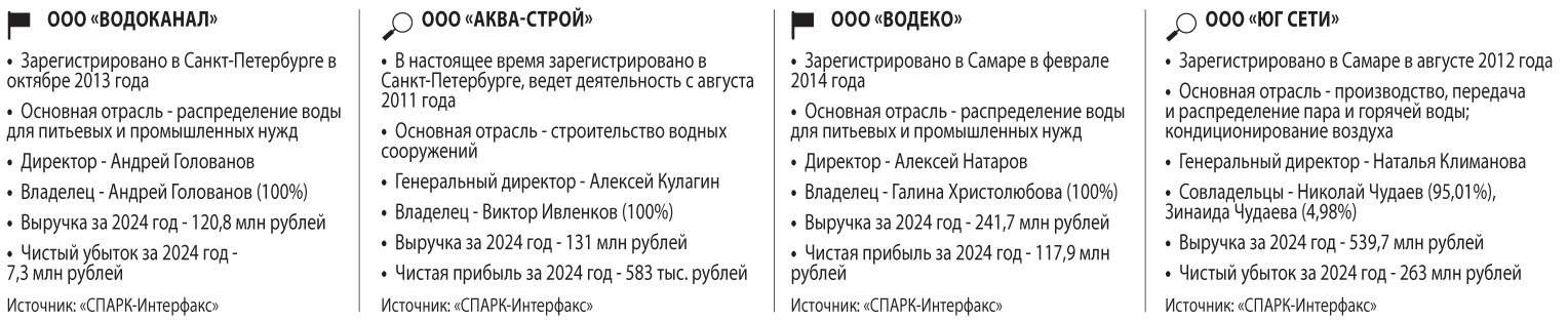 Оставшиеся две компании транспортировщика в настоящее время юридически зарегистрированы в Санкт-Петербурге. ООО «Водоканал» начало свою деятельность в 2013 году в Самаре, собирать тарифы за проточную воду стало с 2016 года — и до недавнего времени работало здесь. Но в конце 2024 года частный «Водоканал» переехал, сначала в Ленинградскую область, а несколькими месяцами спустя — непосредственно в Питер. Выручка компании по итогам 2024 года составила 120,8 млн рублей, но в чистом остатке она ушла в минус — убыток составил 7,3 млн. Согласно информации с официального сайта фирмы, ее «партнерами» являются 200 жилых домов, в том числе — ЖК «Надежда», «Город Солнца», «Изумрудный» и «540 квартал». В шапке сайта закреплено объявление о том, что «Водоканал» принимает на баланс «бесхозные» сети и сети ТСЖ. И почти половина расходов СКС по оплате транспортировки воды в 2024 году пришлась именно на «Водоконал» — ему заплатили 269,7 млн рублей.